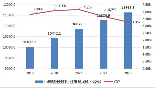 根据尼尔森IQ调研数据显示,2019-2023年期间,中国健康饮料市场规模总体呈现出了持续增长态势,截至2023年底,中国健康饮料市场规模增长至为11643.5亿元,同比2022年期间增长3.3%。