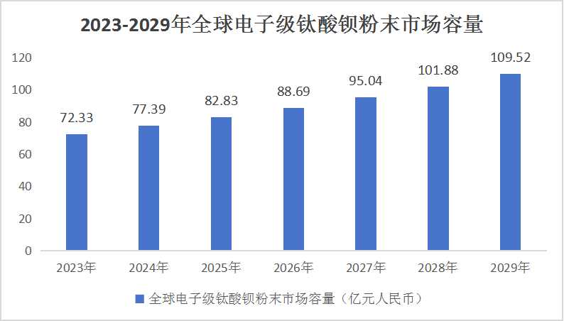 据市场调研数据显示,钛酸钡市场规模呈现稳步增长的趋势。以电子级钛酸钡(BaTiO3)粉末为例,2023年全球与中国电子级钛酸钡粉末市场容量为72.33亿元人民币。预计未来几年,随着技术进步和市场需求的进一步扩大,钛酸钡市场规模将持续增长。据预计,全球电子级钛酸钡粉末市场规模在预测期将以7.16%的复合年增长率(CAGR)增长,到2029年将达到109.52亿元。
