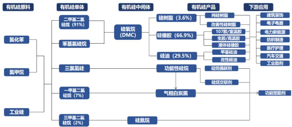 有机硅产业链主要分为上游原材料供应、中游有机硅单体及中间体生产、下游深加工产品及应用三个环节。
